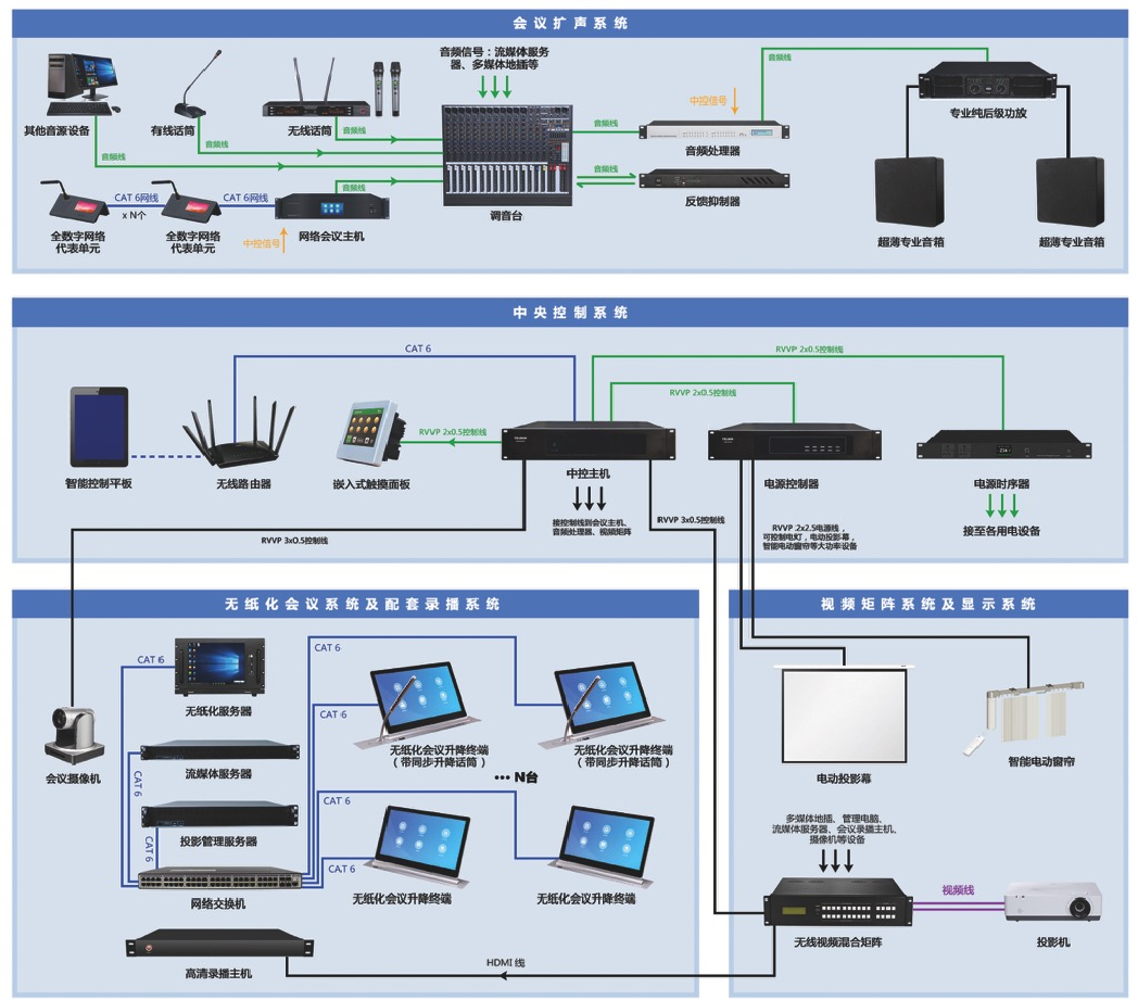 2.整合擴(kuò)聲、發(fā)言、表決、電子桌牌、中控、音視頻信號(hào)切換等模塊,滿足跨部門會(huì)商需求;