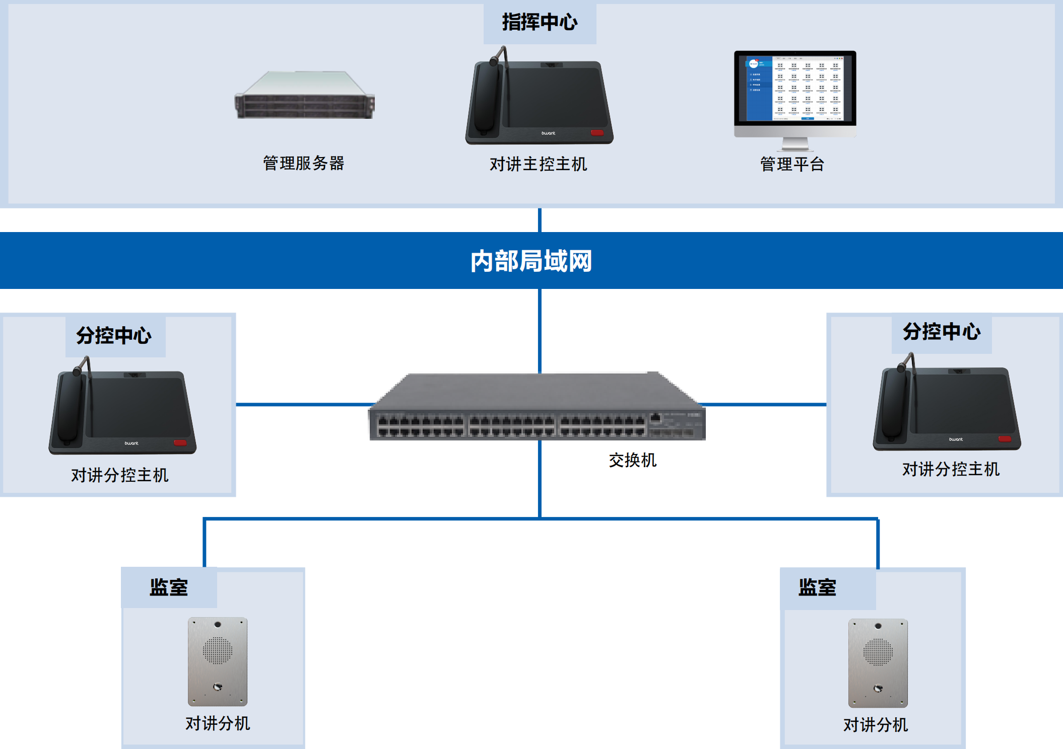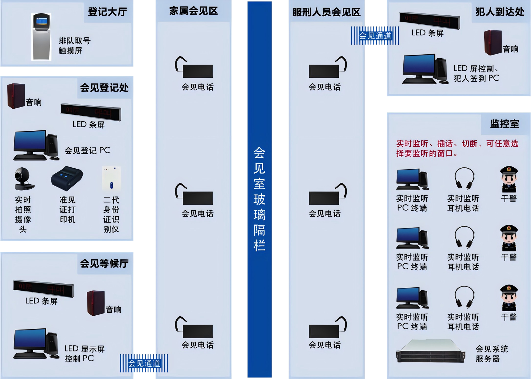 2. 跨區(qū)域協(xié)同低效:監(jiān)區(qū)、審訊室、會(huì)見(jiàn)室等分散區(qū)域亟需實(shí)時(shí)通訊與快速響應(yīng)能力;