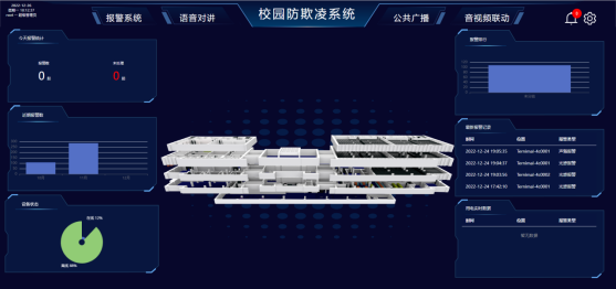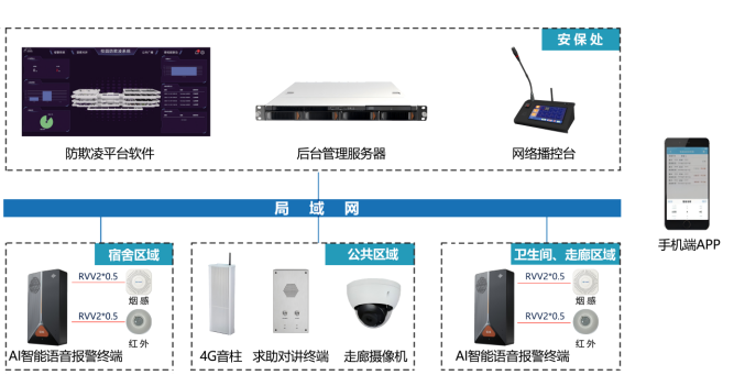 系統還支持手機APP管控,即使不在學校,也能放心監控。區別于傳統報警,該架構還支持雙向交互,AI智能語音報警終端不僅可以跟廣播話筒進行雙向對講,還集成了多種報警模塊(聲強報警、煙感報警、紅外報警、光感報警),每一種報警都有獨立的報警聲音反饋,對前端學生發起提醒。