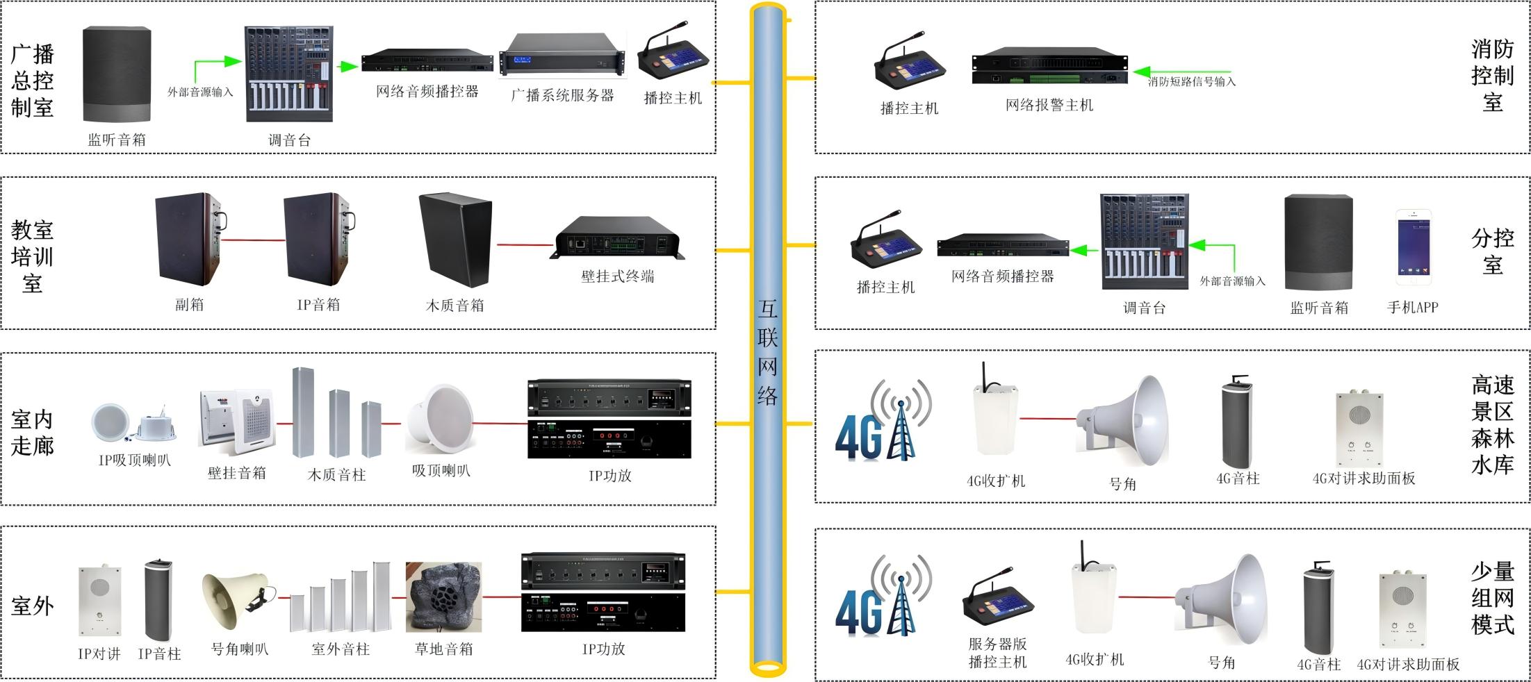 智慧網絡云廣播系統由廣播主控設備、分控設備、前端廣播擴聲終端三部份設備組成,其中后臺主控設備主要指廣播系統服務器與配套軟件、播控主機、網絡音頻播控器、IP音箱、CD機/調諧收音機等音源設備組成,設備均部署于廣播總機房或監控室,分控設備包含分控電腦與配套客戶端軟件、播控主機、網絡音頻播控器、IP音箱、手機APP、CD機/調諧收音機等音源設備。前端廣播擴聲終端由IP網絡終端與4G網絡終端組成。所有網絡設備均通過4G網絡與互聯網接入系統平臺進行通迅。